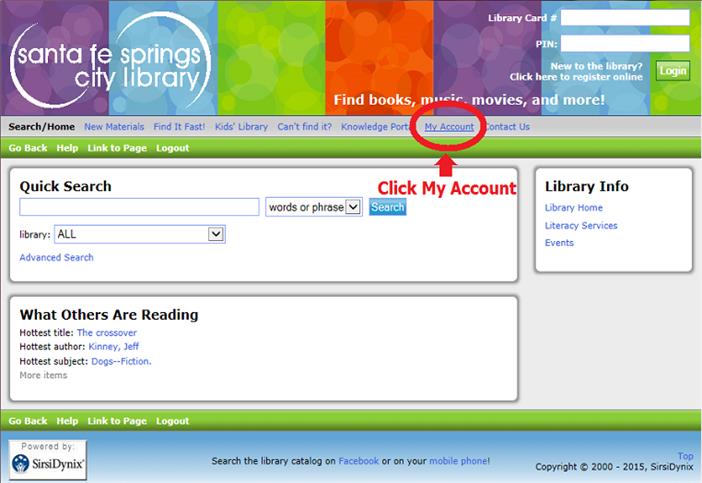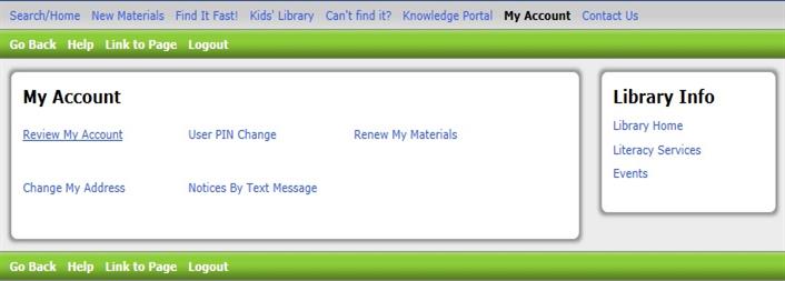 2. My Account page should open with the choices to Review My Account, User PIN Change, Renew My Materials, etc.