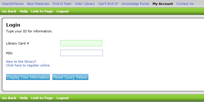 3. Login screen will appear. Type in your Library Card # and PIN (last 4 numbers of your phone number) then hit enter or click Display User Information.